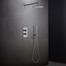 1. Смеситель термостатический из латуни на 2 потребителя (внешняя и скрытая часть) 2. Душевой гарнитур: лейка, шланг, шланговое подсоединение с держателем 3. Верхний душ 4. Декоративные накладки на стену из нержавеющей стали 3 мм