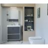 Геометрия лаконичных фасадов украсит помещение ванной комнаты и сделает его строже и гармоничнее. Современная фурнитура грамотно раставляет акценты и зрительно вытягивает пространство. Качественные механизмы обеспечивают плавность хода дверцам шкафа и ящикам тумбы. Продуманная эргономичность и вместительность позволяет расставить все по своим местам в ванной комнате.