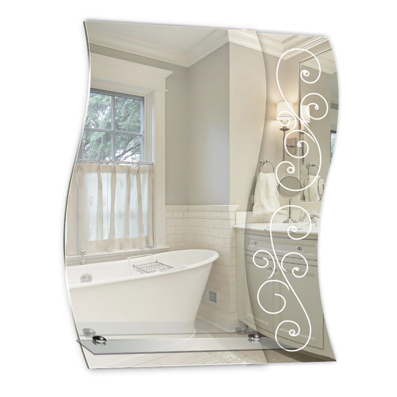 Пескоструйный рисунок добавит зеркалу нотку индивидуальности и неповторимости. На практичной полочке из стекла будет удобно хранить гигиенические средства и мелкие аксессуары.