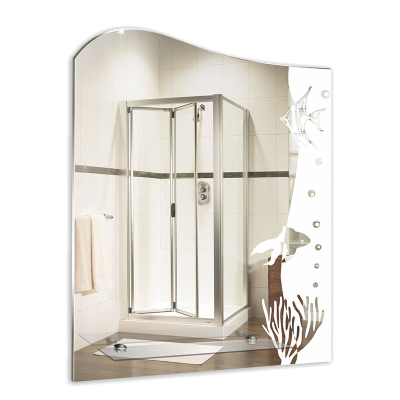 Пескоструйный рисунок добавит зеркалу нотку индивидуальности и неповторимости. На практичной полочке из стекла будет удобно хранить гигиенические средства и мелкие аксессуары.