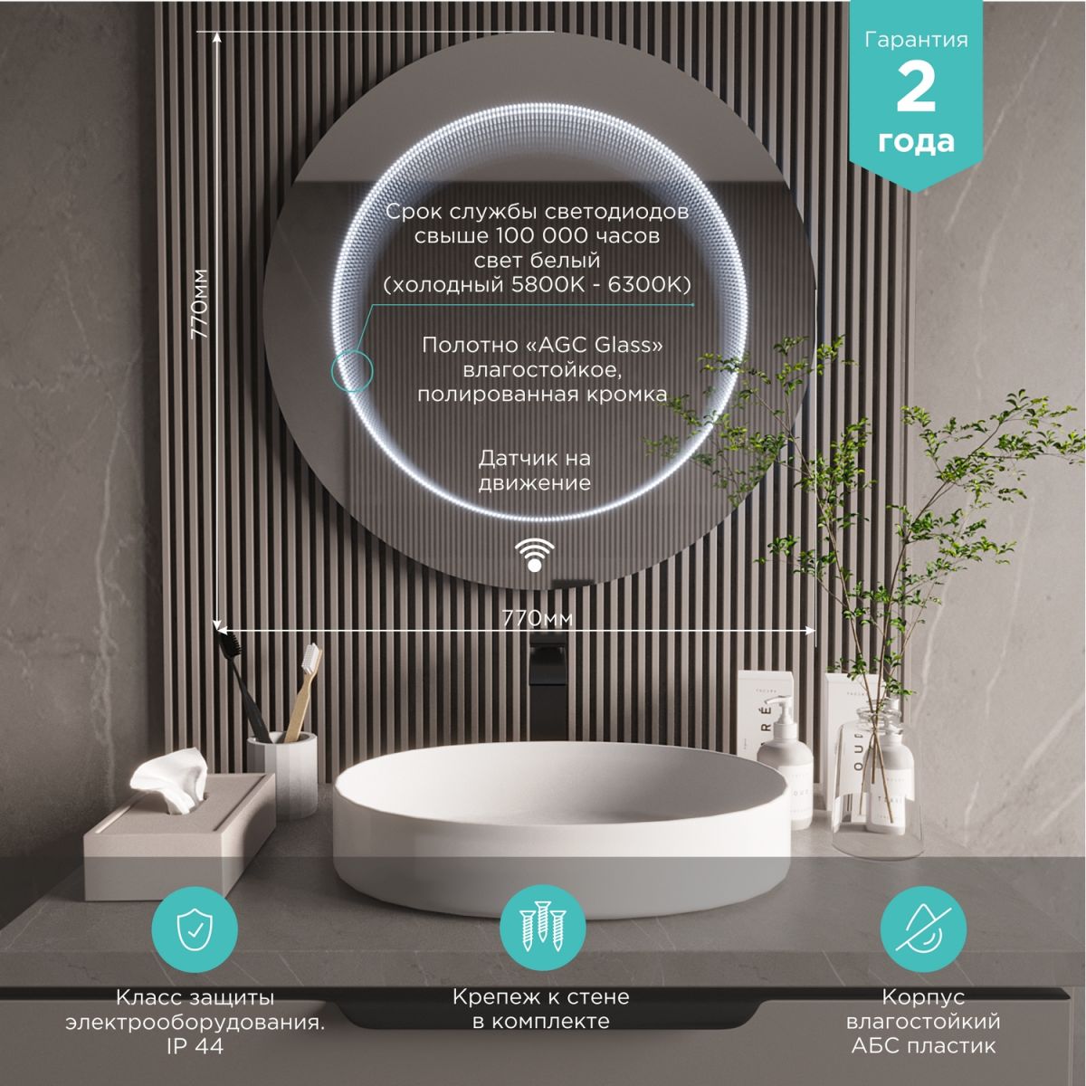 Гарантия:2 года;Длина эл/провода, мм:1200;Категория:Зеркала;Материал корпуса:ABS-пластик;Монтаж:Подвесное;Мощность, Вт:25;Наличие полочки:Нет;Обработка поверхности полотна:Без обработки;Обработка торца полотна:Полированная кромка;Подкатегория:Зеркала;Подогрев:Нет;Подсветка:Внутренняя;Тип включения:Датчик на движение (взмах руки);Тип подключения:Вилка;Тип подсветки:Светодиодная лента;Трансформатор:Да;Форма полотна:Круг;Цоколь:Нет;Ширина, см:770