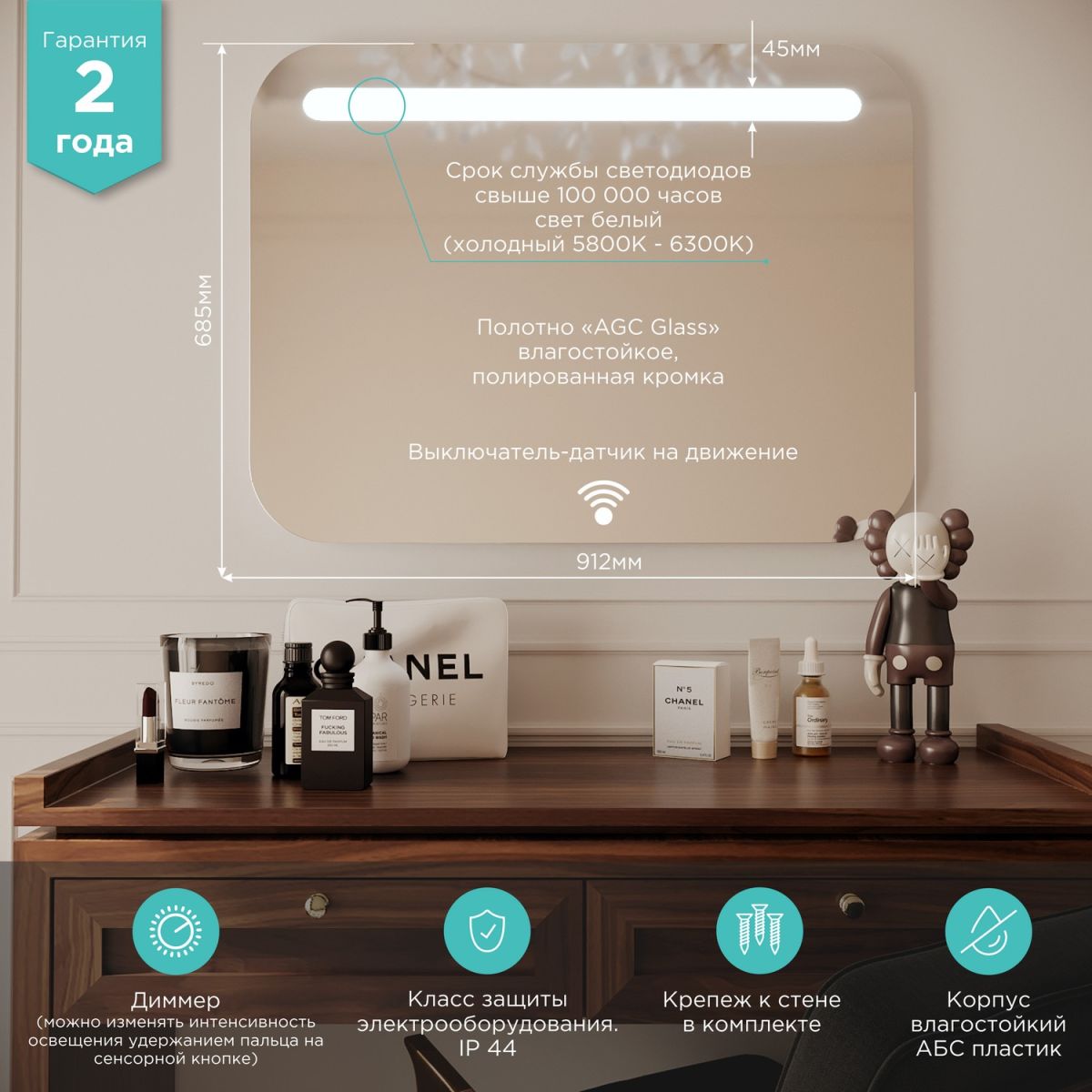 Гарантия:2 года;Длина эл/провода, мм:1200;Категория:Зеркала;Материал корпуса:ABS-пластик;Монтаж:Подвесное;Мощность, Вт:25;Наличие полочки:Нет;Обработка поверхности полотна:Без обработки;Обработка торца полотна:Полированная кромка;Подкатегория:Зеркала;Подогрев:Нет;Подсветка:Внутренняя;Тип включения:Бесконтактный сенсор;Тип подключения:Вилка;Тип подсветки:Светодиодная лента;Трансформатор:Да;Форма полотна:Прямоугольник;Цоколь:Нет;Ширина, см:915